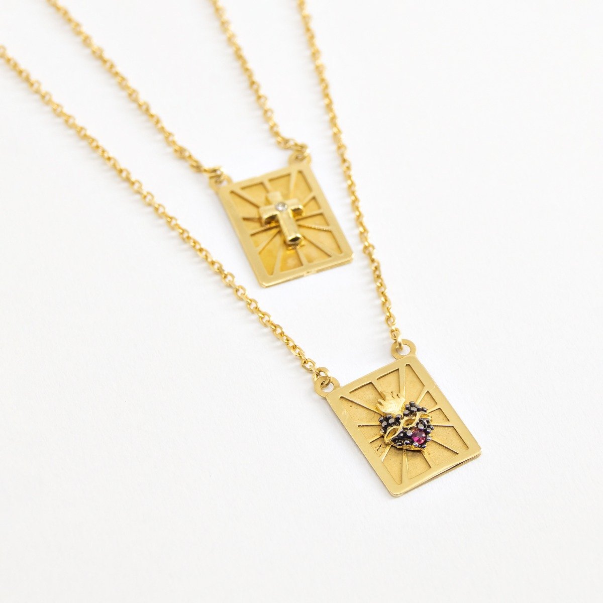 Jóia em Ouro 18K. Corrente de 60cm. Pingentes de 1cm de altura por 8 mm de largura. Coração de rubis de 3mm por 3mm. Cruz com 3mm de altura por 2mm de largura e diamante de 0,5pt. Peso aproximado da peça é de 2.4g
